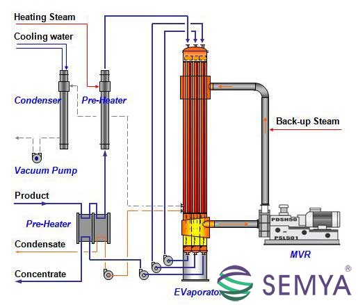 蒸汽機(jī)械再壓縮蒸發(fā)器簡(jiǎn)稱MVR蒸發(fā)器,相較于傳統(tǒng)的多效蒸發(fā),是一種高效、節(jié)能的技術(shù)。MVR蒸發(fā)器是指機(jī)械式熱能壓縮蒸發(fā)器,是國(guó)際上二十世紀(jì)九十年代末開發(fā)出來(lái)的新型高效蒸發(fā)設(shè)備。其工作原理是蒸發(fā)器產(chǎn)生的二次蒸汽經(jīng)機(jī)械式熱能壓縮機(jī)(類似于鼓風(fēng)機(jī))作用后,溫度提升5~8℃,返回用于蒸發(fā)器的加熱熱源,新鮮蒸汽僅用于補(bǔ)充熱損失和補(bǔ)充進(jìn)出料熱焓,從而大幅度減低蒸發(fā)器對(duì)外來(lái)新鮮蒸汽的消耗。原來(lái)要廢棄的蒸汽就得到了充分的利用,回收了潛熱,又提高了熱效率,生蒸汽的經(jīng)濟(jì)性相當(dāng)于多效蒸發(fā)的30效,減少了對(duì)外部加熱及冷卻資源的需求,降低能耗,減少污染。