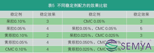通過感官打分,比較出穩(wěn)定性最好的穩(wěn)定劑配方為:果膠0.05%,CMC 0.05%(均為質(zhì)量分?jǐn)?shù))。