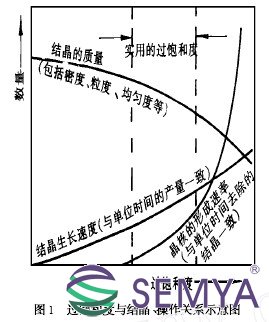 對(duì)結(jié)晶影響最主要的因素是溶液的過(guò)飽和度,如果溶液沒(méi)有過(guò)飽和度,晶核既不能生成,結(jié)晶也不能生長(zhǎng)。過(guò)飽和度大一些對(duì)生產(chǎn)有利,因?yàn)橥苿?dòng)力大,晶核的形成速率和結(jié)晶的生長(zhǎng)速率都大,但也不是越大越好。如果料液過(guò)飽和度太大,晶核形成速率很快上升,使結(jié)晶生長(zhǎng)速率降低,會(huì)出現(xiàn)產(chǎn)品粒度過(guò)細(xì),影響產(chǎn)品質(zhì)量。過(guò)飽和度與結(jié)晶、操作關(guān)系示意如圖1 所示