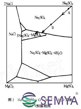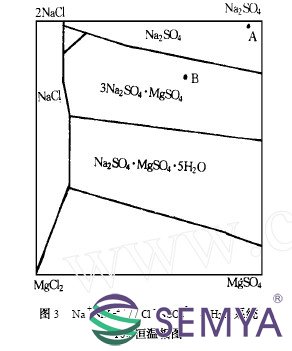 無(wú)水硫酸鈉生產(chǎn)所使用的原料中,除了主要的Na+ 、SO42 -離子外,一般都含有少量的Ca2 + 、Mg2 + 、和Cl -離子,生產(chǎn)時(shí)蒸發(fā)器內(nèi)壓力、溫度等條件保持不變,隨著蒸發(fā)的進(jìn)行,結(jié)晶的硫酸鈉不斷取出, 料液中Ca2 + 、Mg2 + 離子濃度相對(duì)增大, 體現(xiàn)在Na + 、Mg2 + // Cl -、SO42--H2O 相圖上,如開(kāi)始在A 點(diǎn),生產(chǎn)一段時(shí)間后體系移到B 點(diǎn)見(jiàn)圖2, 繼續(xù)生產(chǎn),體系逐漸由Na2SO4 的結(jié)晶區(qū)移到Na2SO4 與復(fù)鹽3Na2SO4 ·MgSO4 的共飽線(xiàn)上,此時(shí)無(wú)水鈉鎂礬開(kāi)始析出,在操作溫度不變情況下,體系將沿此共飽線(xiàn)移動(dòng),產(chǎn)品質(zhì)量開(kāi)始下降。如果溫度升高時(shí),Na2SO4 的結(jié)晶區(qū)逐漸縮小,而3Na2SO4 ·MgSO4 的結(jié)晶區(qū)逐漸增大, 體系落在了3Na2SO4 ·MgSO4的結(jié)晶區(qū),顯然此時(shí)已不是我們所需要的產(chǎn)品了見(jiàn)圖3 。由于無(wú)水鈉鎂礬的結(jié)晶顆細(xì)小,在粘度較大的硫酸鈉溶液中不易沉降,蒸發(fā)罐內(nèi)就會(huì)呈現(xiàn)糊狀,使蒸發(fā)無(wú)法正常進(jìn)行,結(jié)晶也不會(huì)再繼續(xù)長(zhǎng)大,排出的料液經(jīng)離心機(jī)脫水非常困難,濕硝中母液含量較大,氣流干燥也無(wú)法正常運(yùn)行,產(chǎn)品放置時(shí)間長(zhǎng)了便結(jié)為大塊。為避免上述現(xiàn)象發(fā)生,除對(duì)硝液進(jìn)行凈化外,應(yīng)適當(dāng)降低排料溫度,即降低蒸發(fā)終溫。從圖2 、圖3 中可以看出,Na2SO4的結(jié)晶區(qū)隨著溫度的降低而增大,這不僅提高了產(chǎn)品產(chǎn)量,而且極大的降低了雜鹽的析出量,大大提高了產(chǎn)品質(zhì)量。那么是不是排料溫度越低越好呢? 也不是,圖4 是Na2SO4 -H2O 系統(tǒng)相圖,從圖中可以看出,硫酸鈉溶解度在32138 ℃最大,低于此溫度時(shí),系統(tǒng)不再結(jié)晶Na2 SO4 , 而是結(jié)晶出Na2 SO4 ·10H2O 。當(dāng)料液溫度接近32138 ℃時(shí), 由于硫酸鈉溶解度增大,產(chǎn)量將受到影在水中響, 這對(duì)生產(chǎn)是不利的。